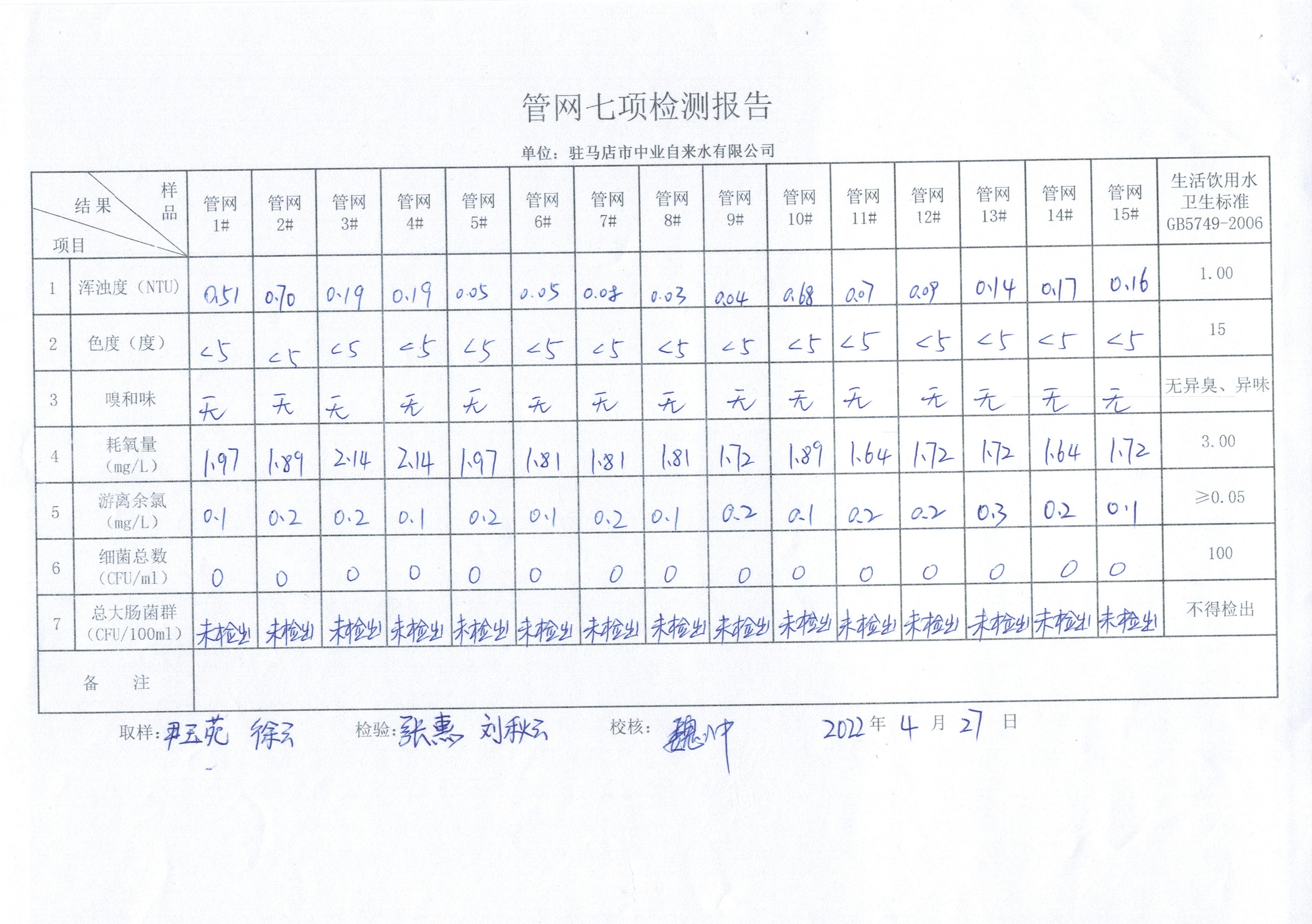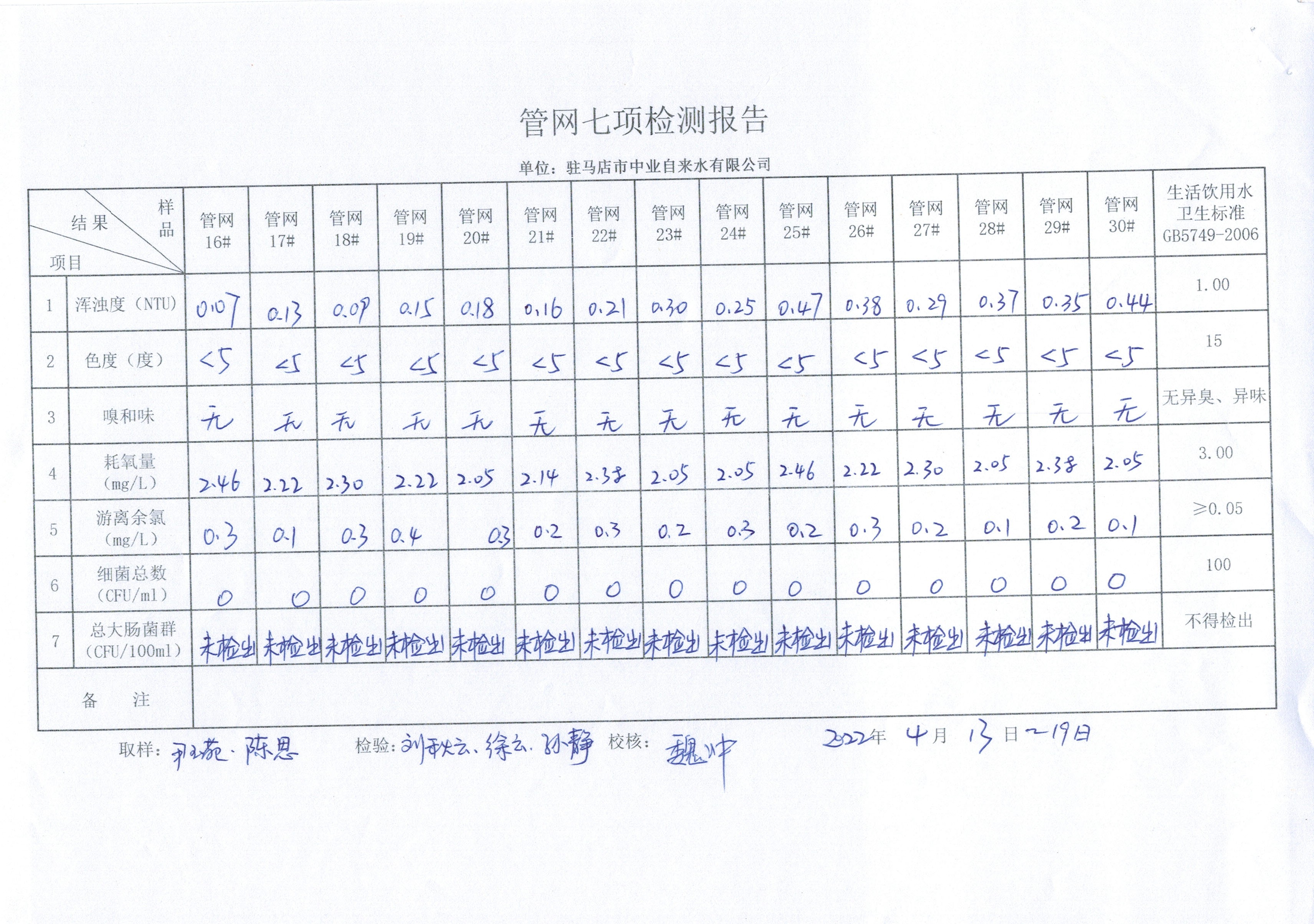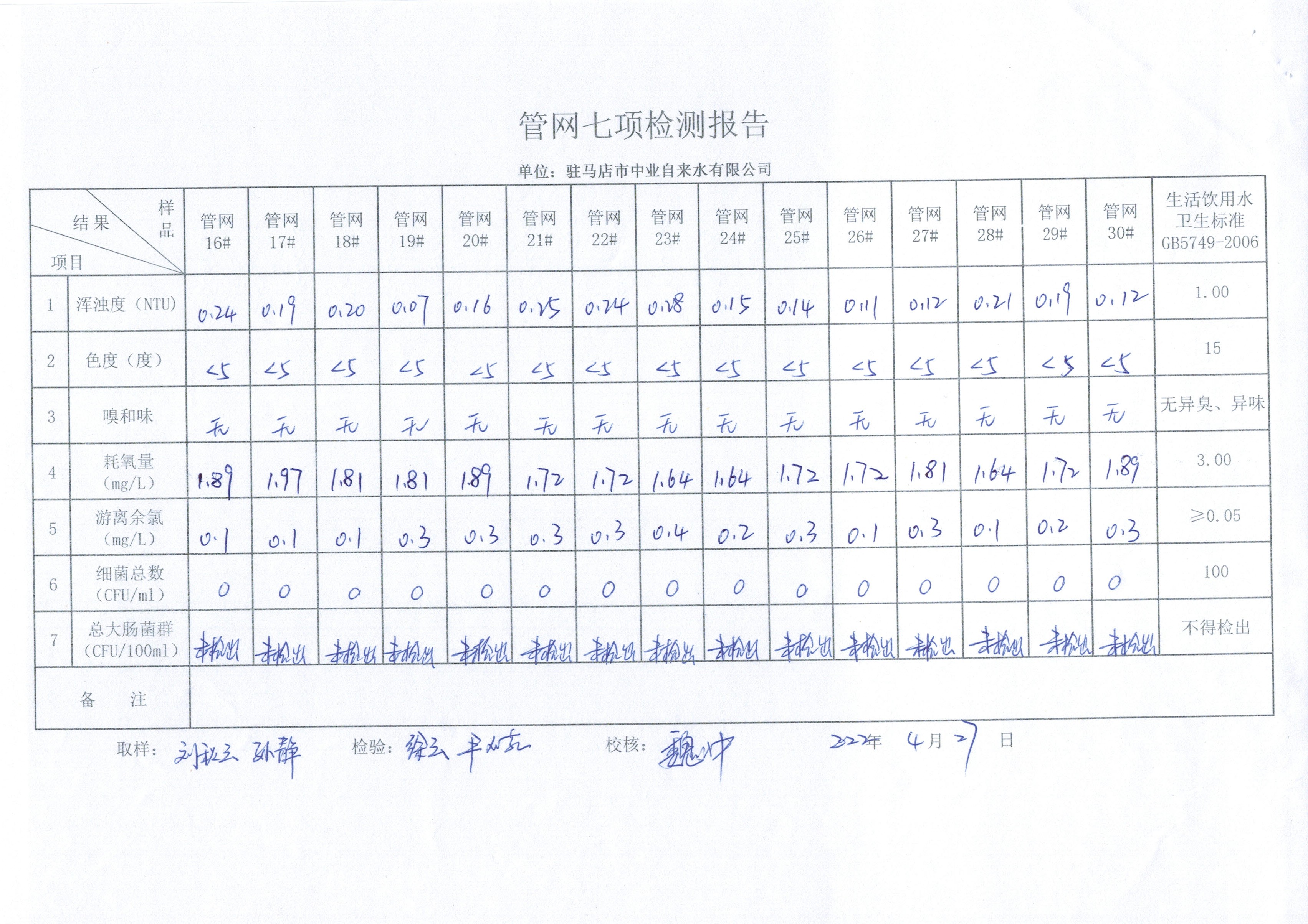 2022年4月管网水质监测数据