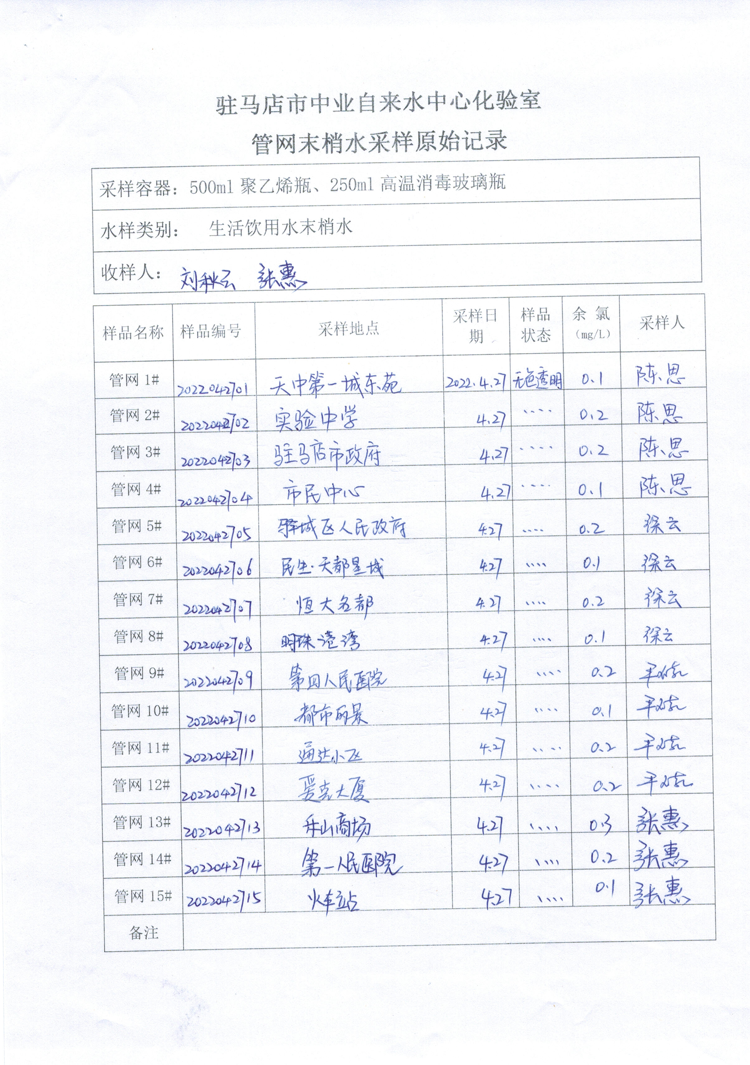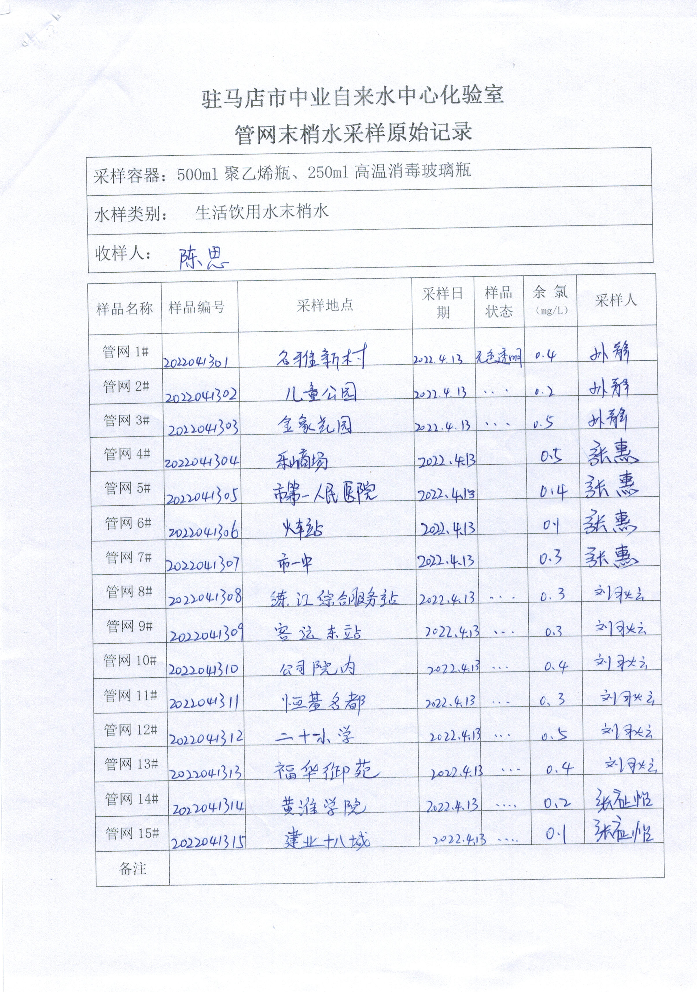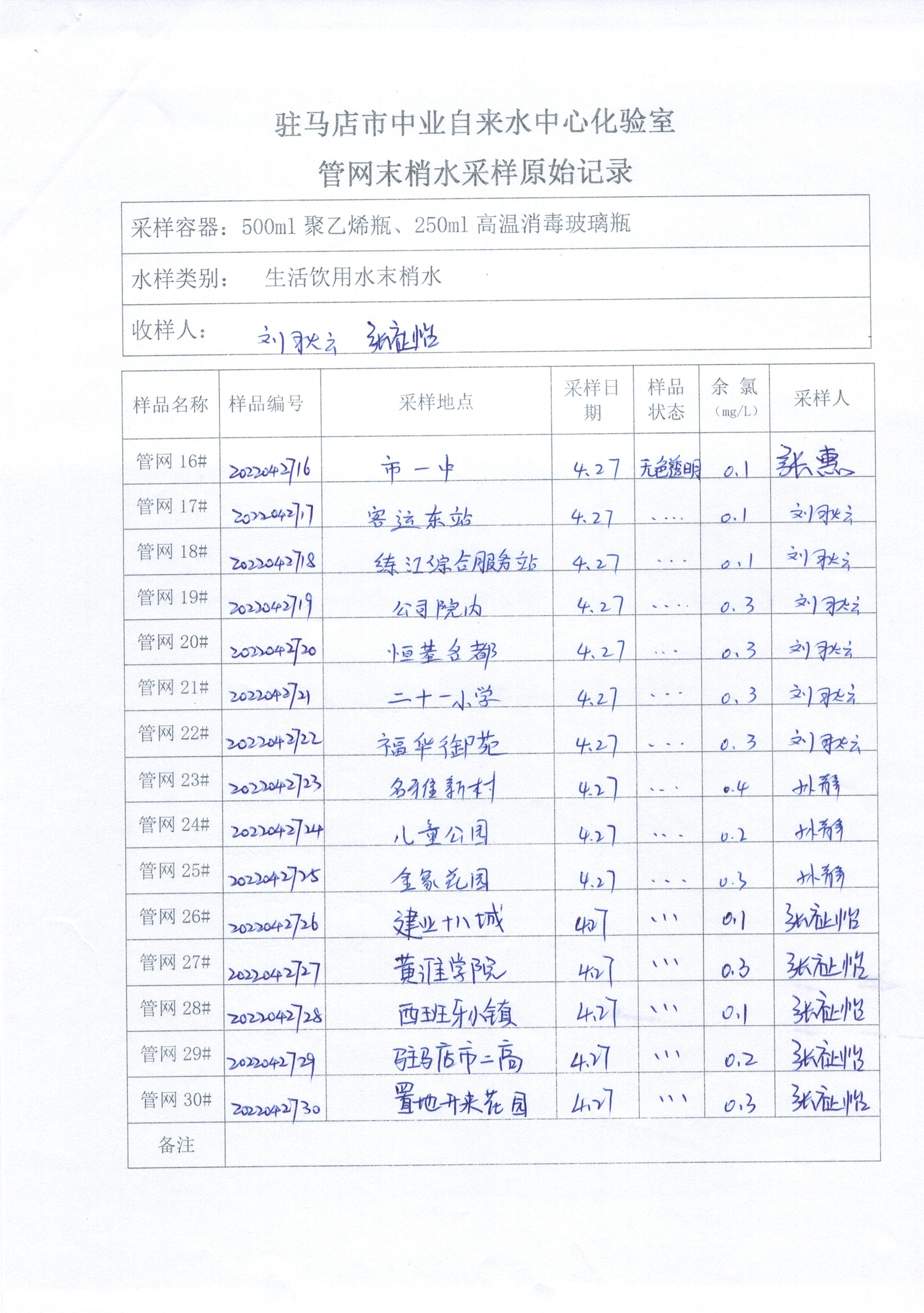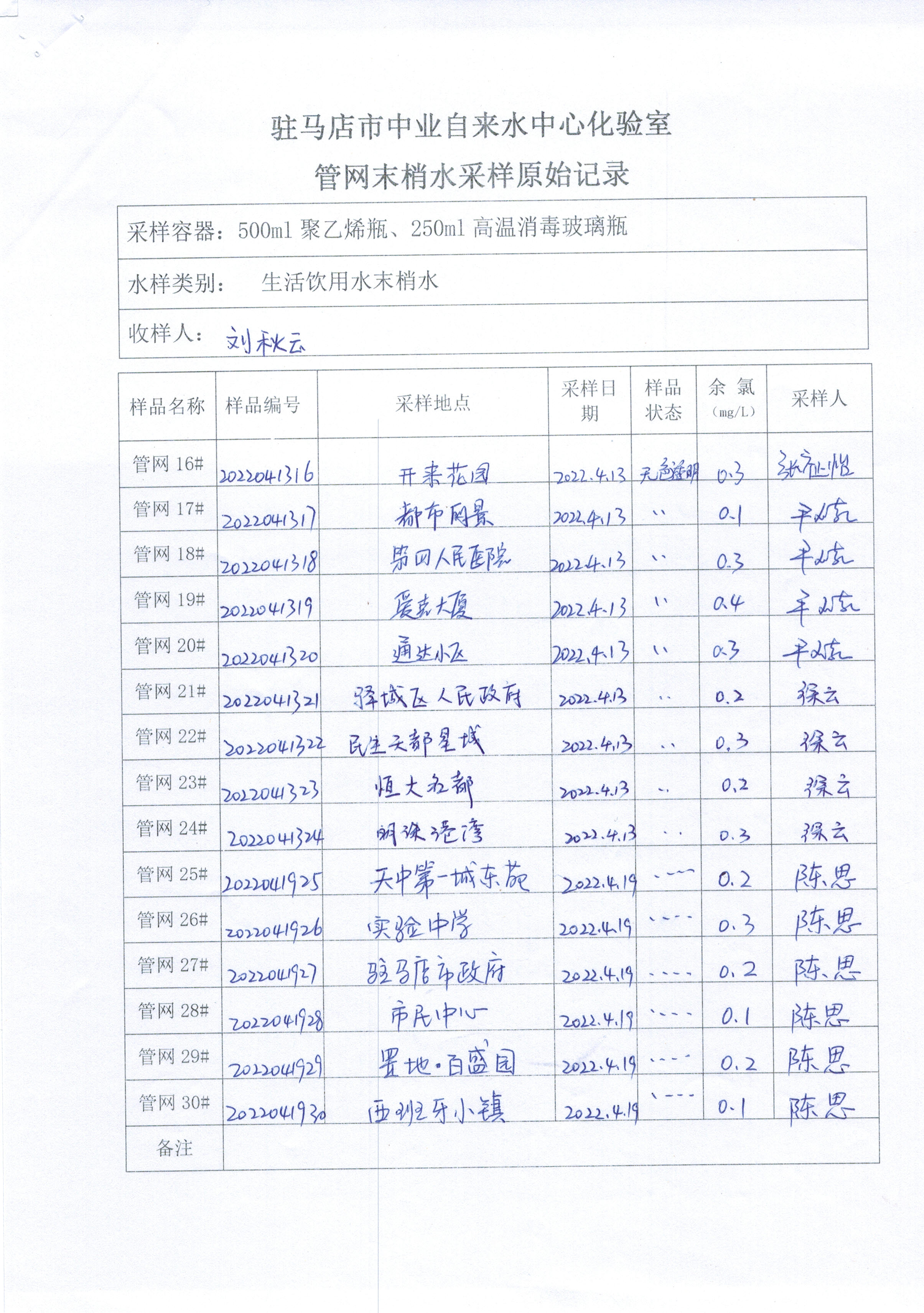 2022年4月管网水质监测数据