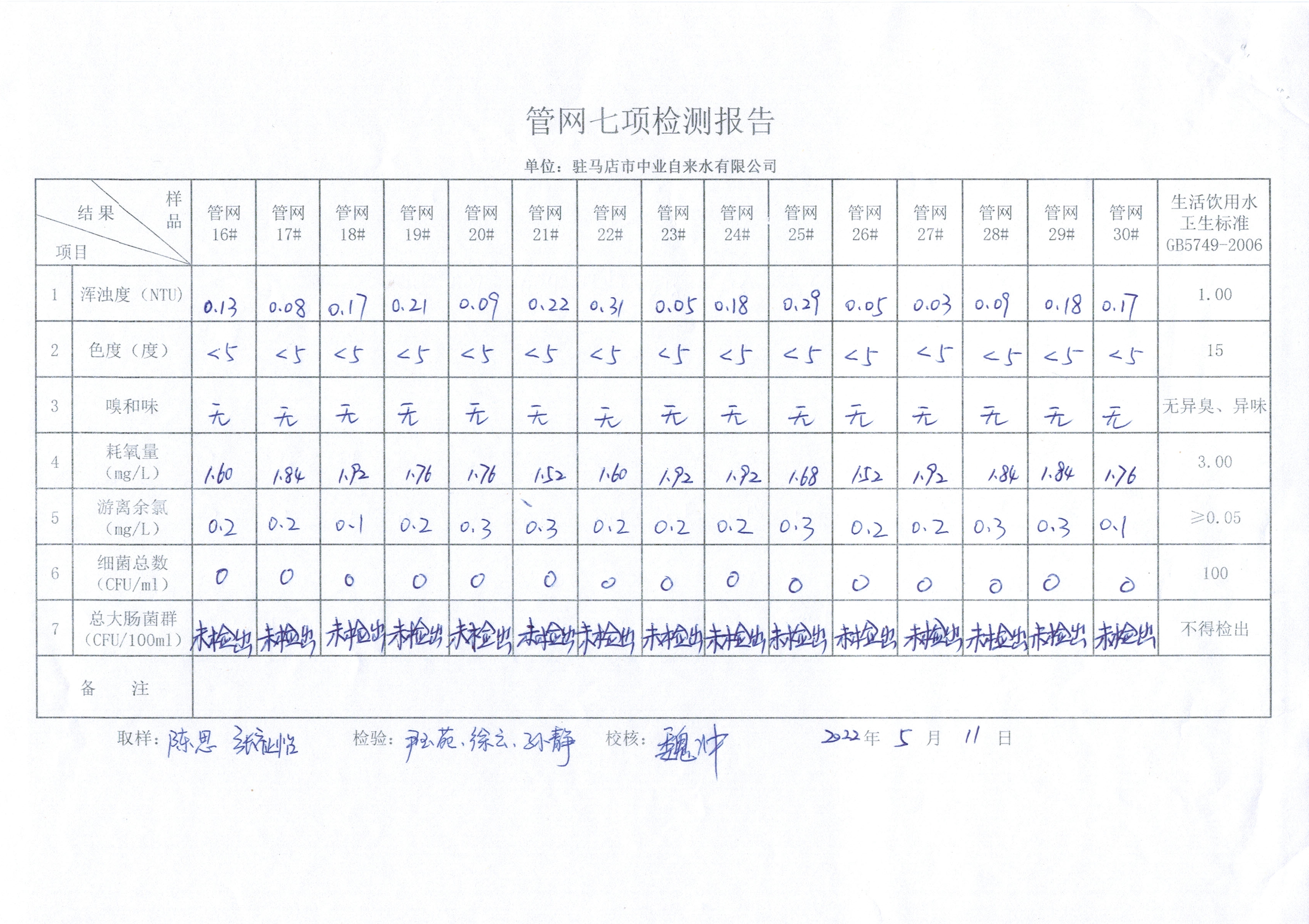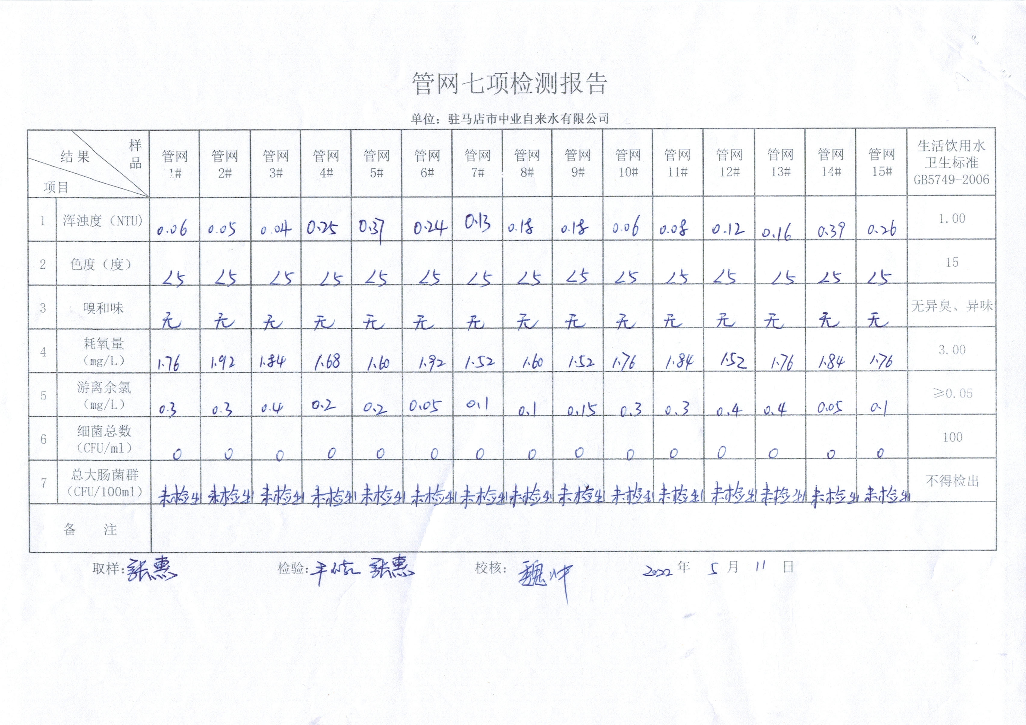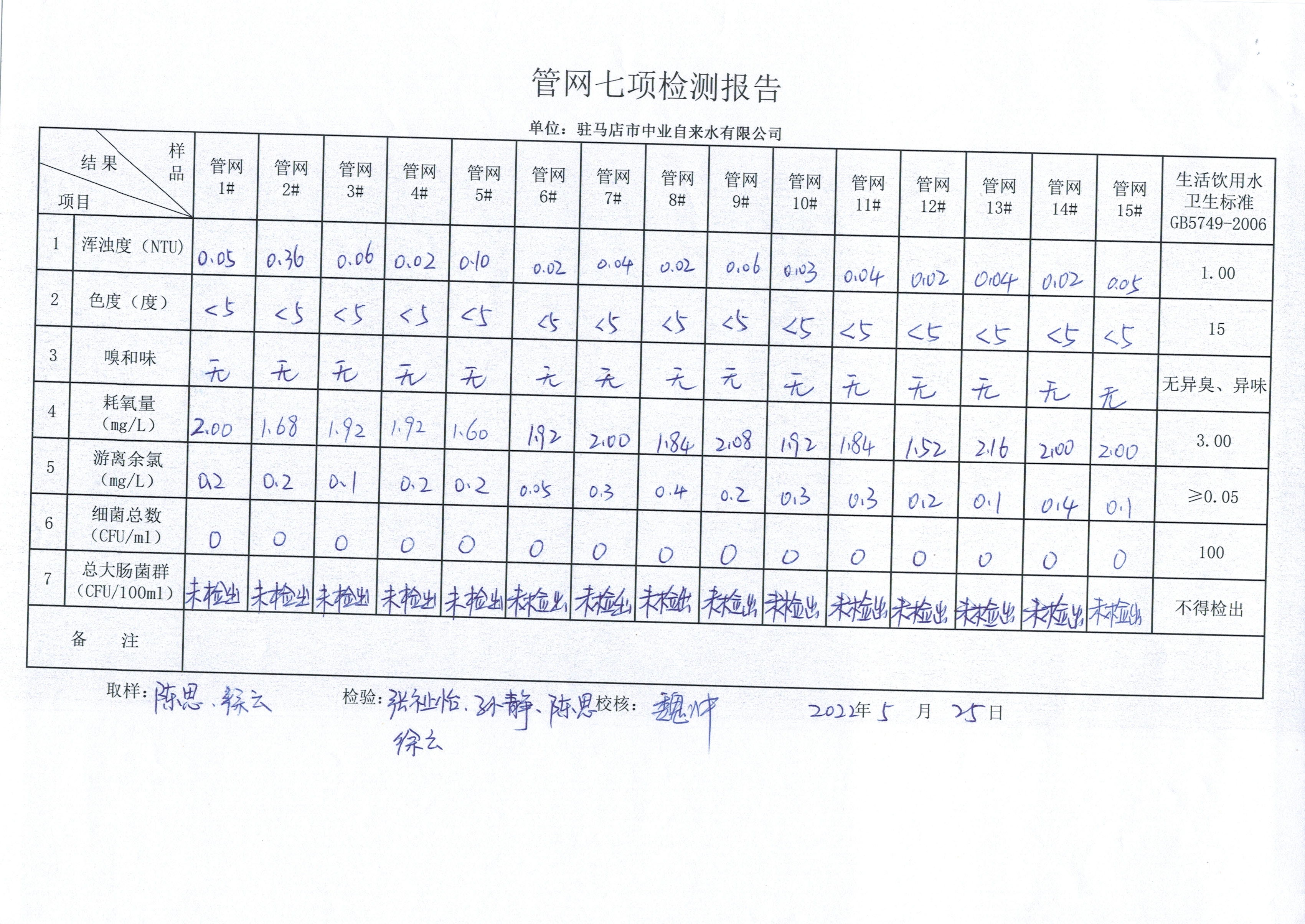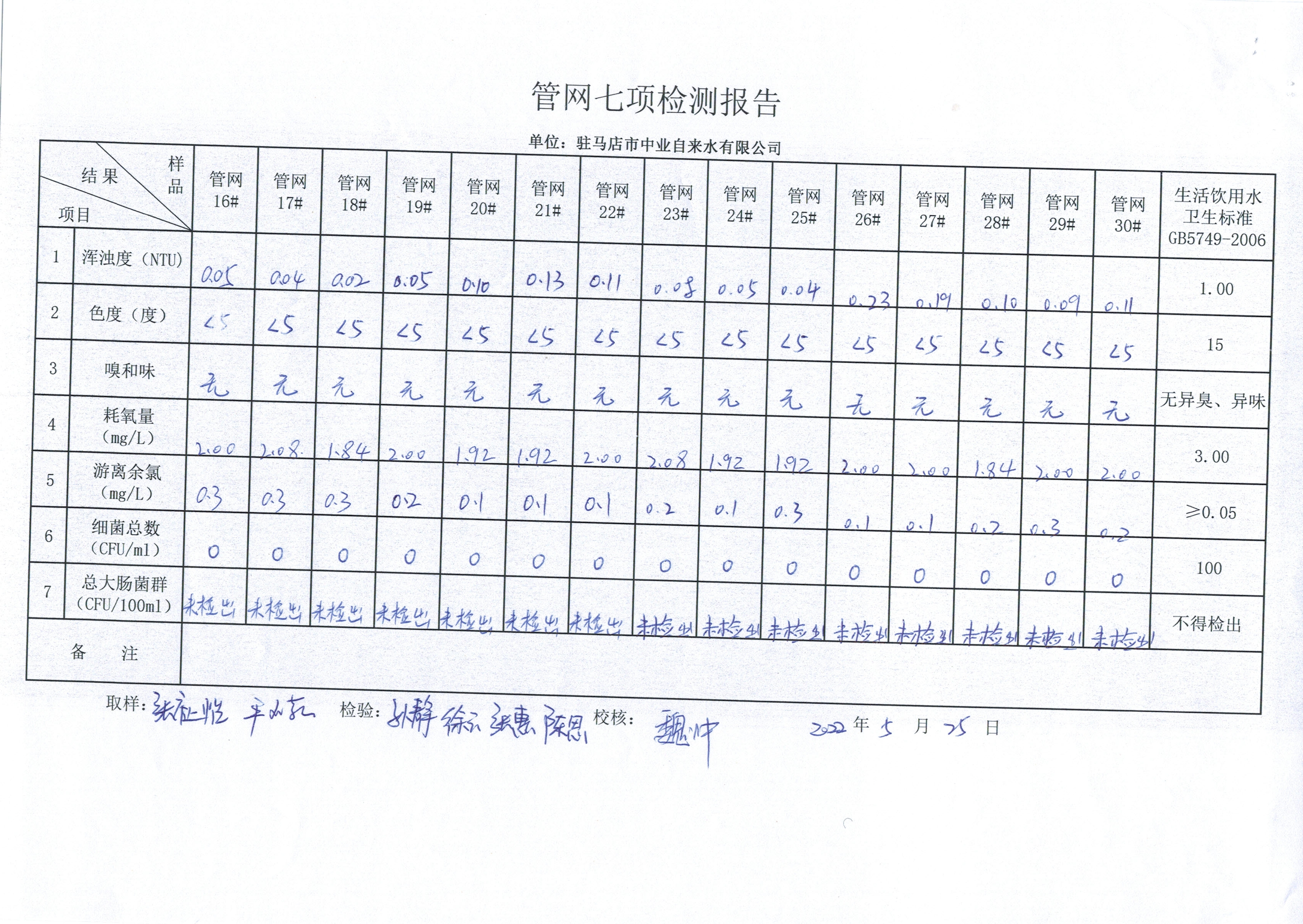 2022年5月管网水质监测数据