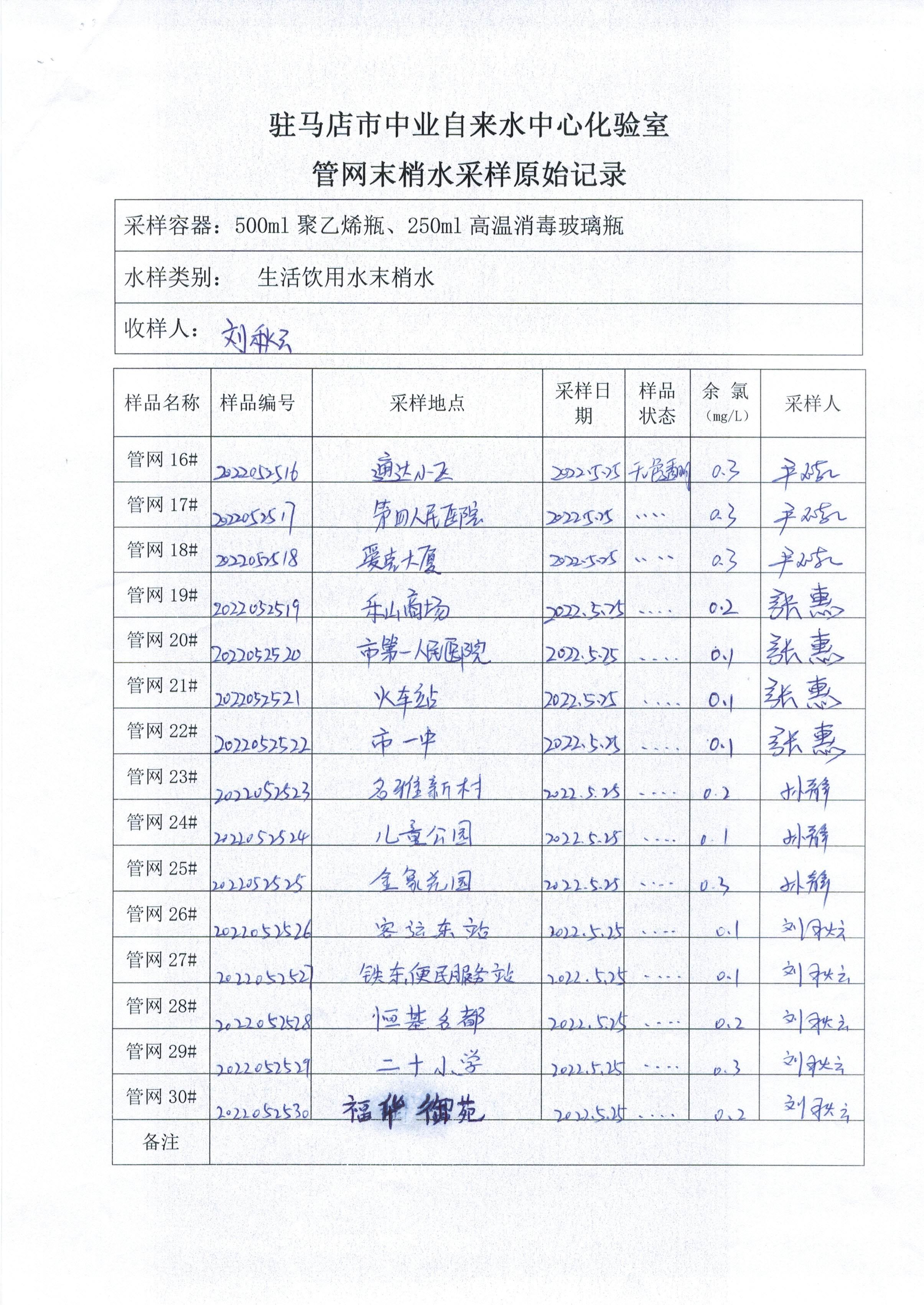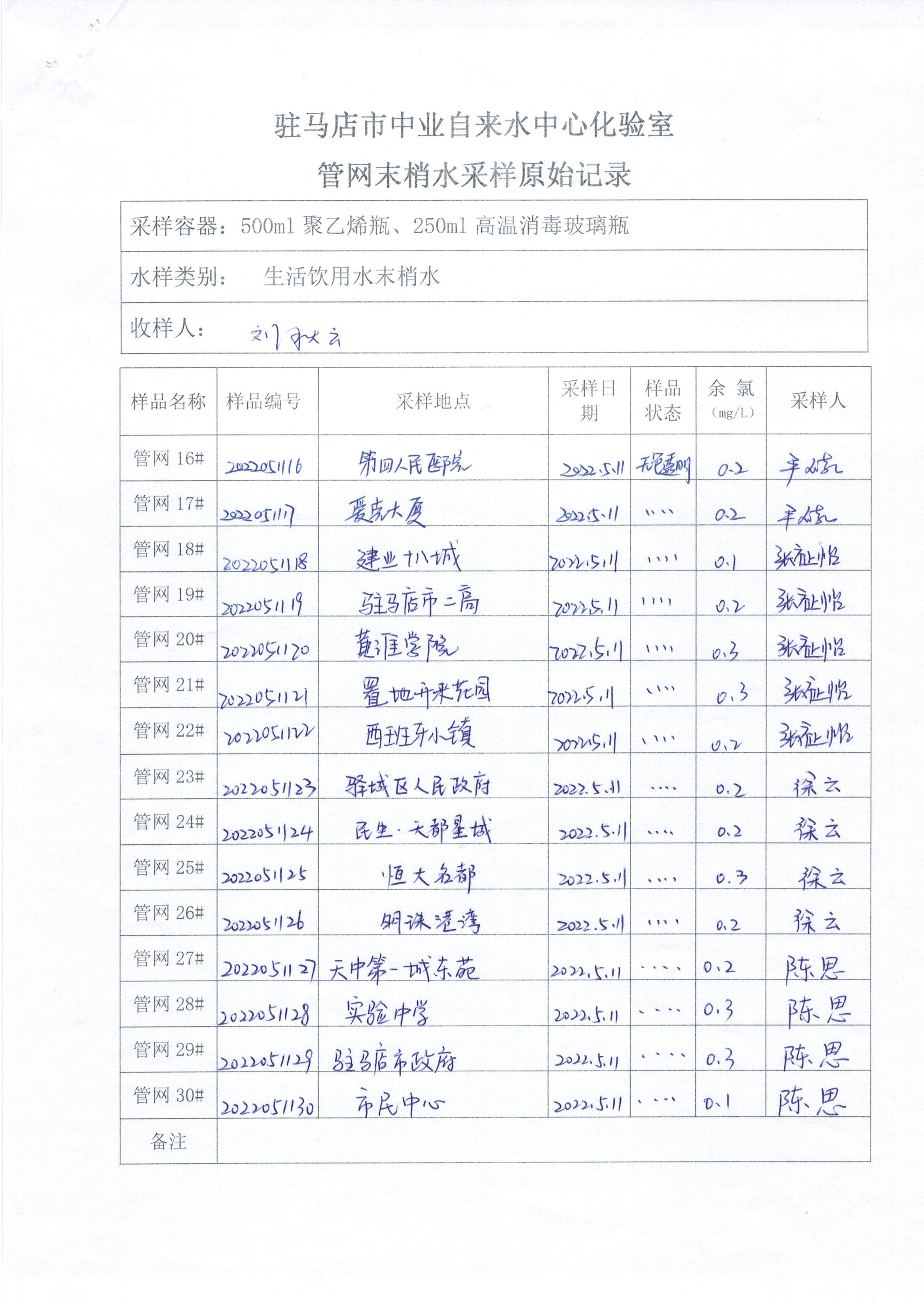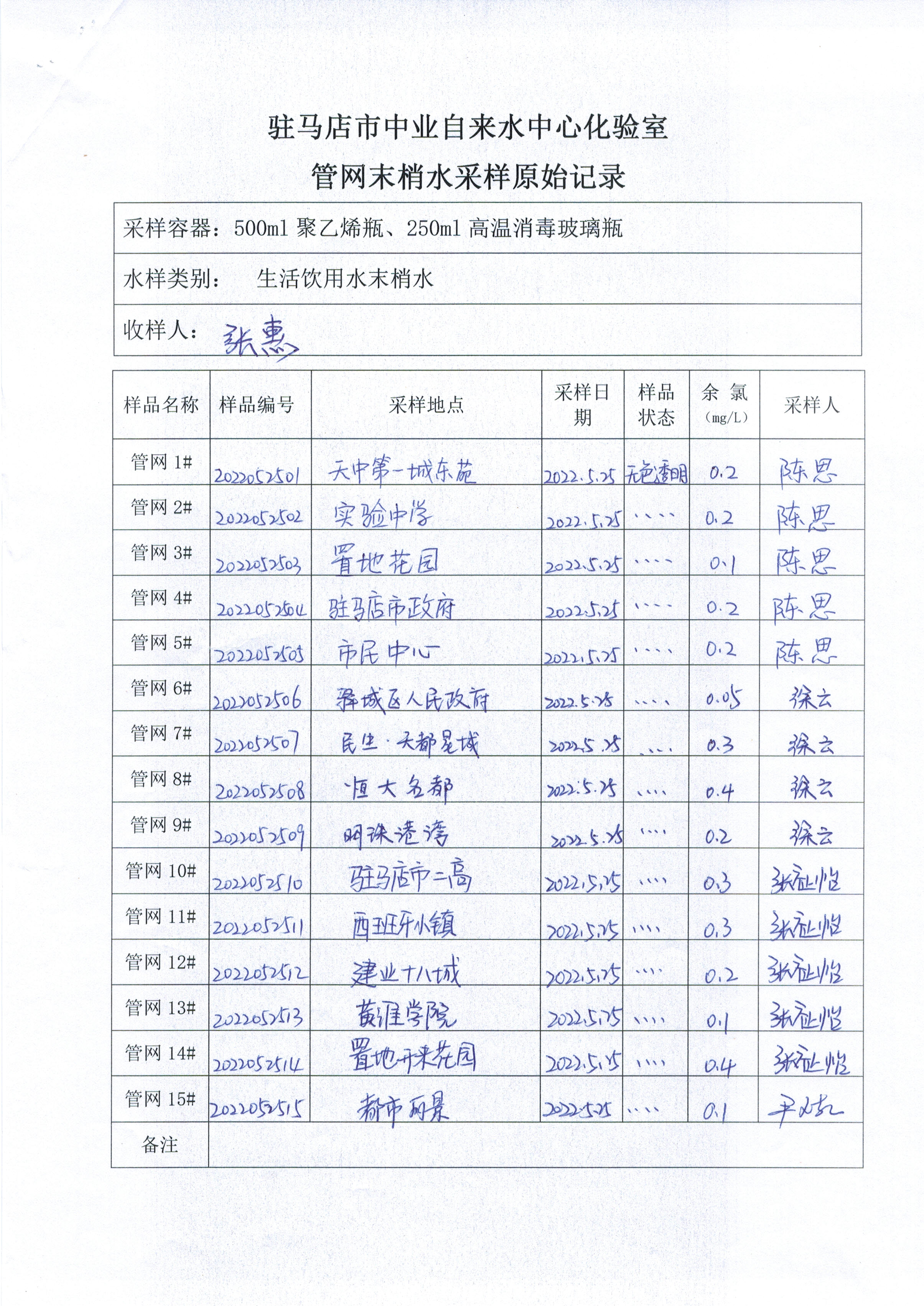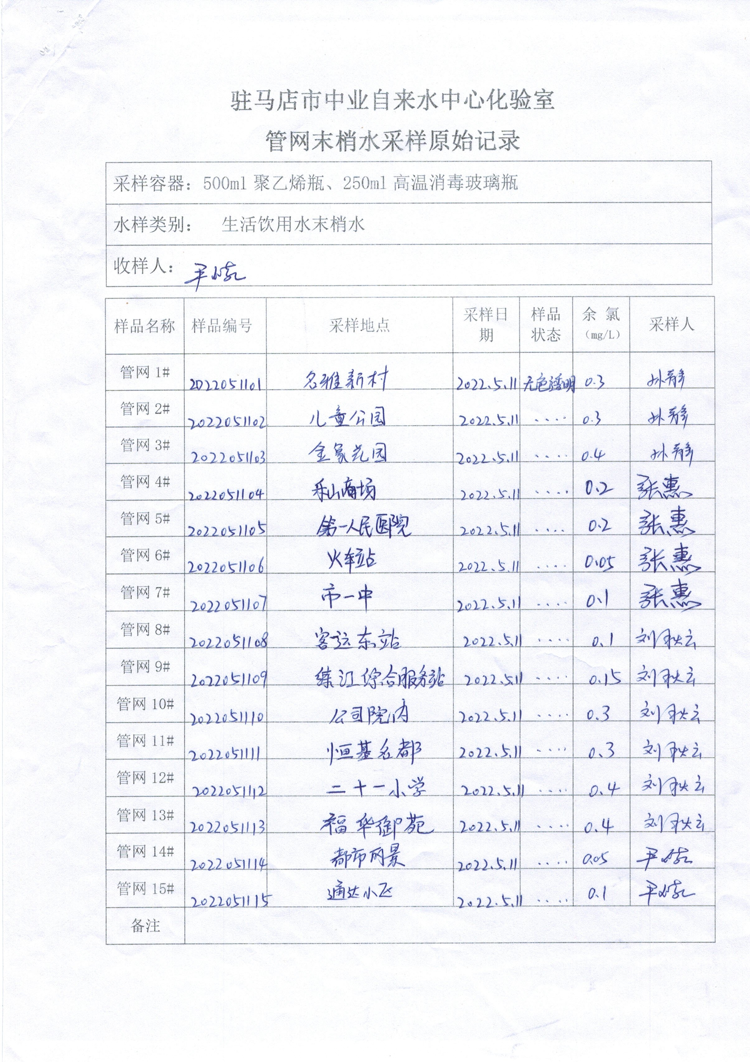2022年5月管网水质监测数据
