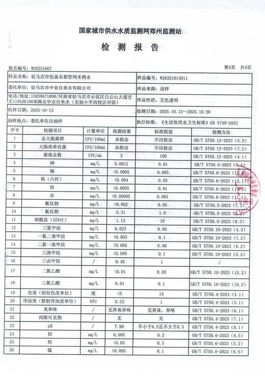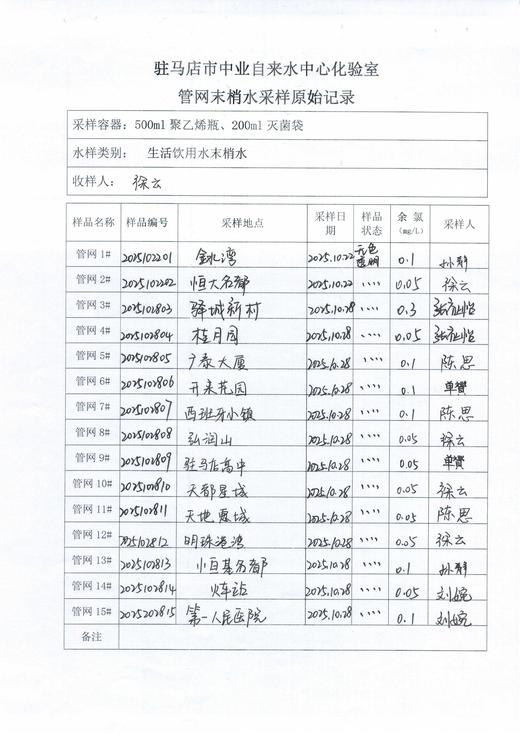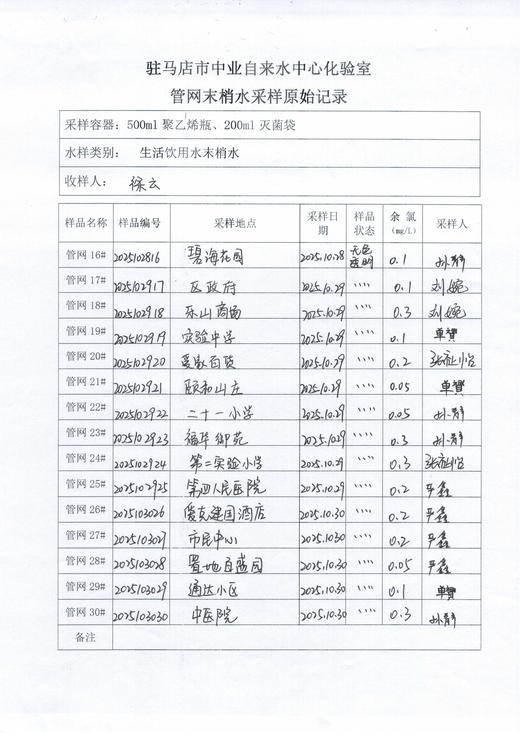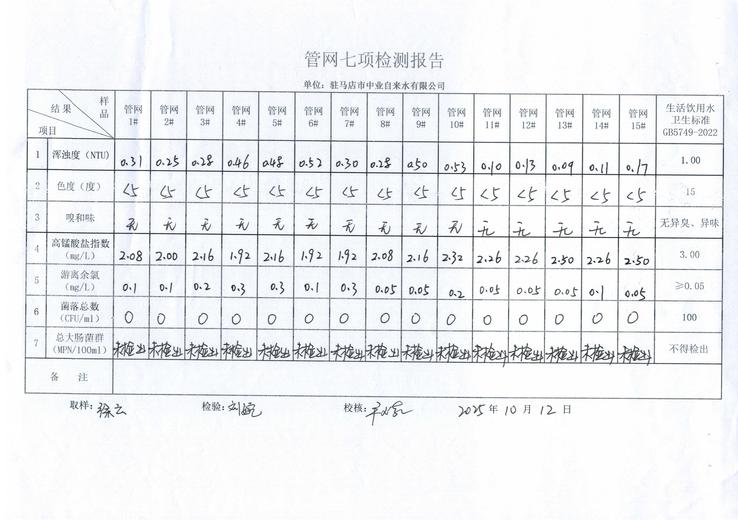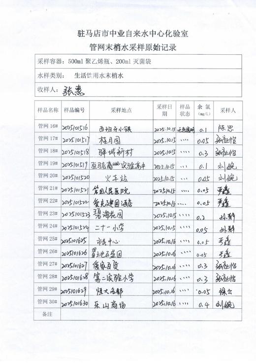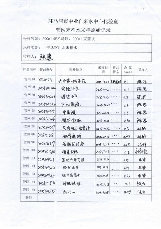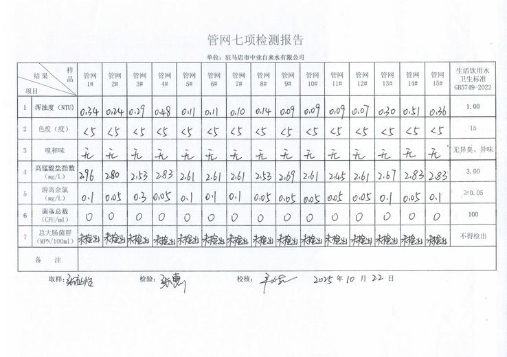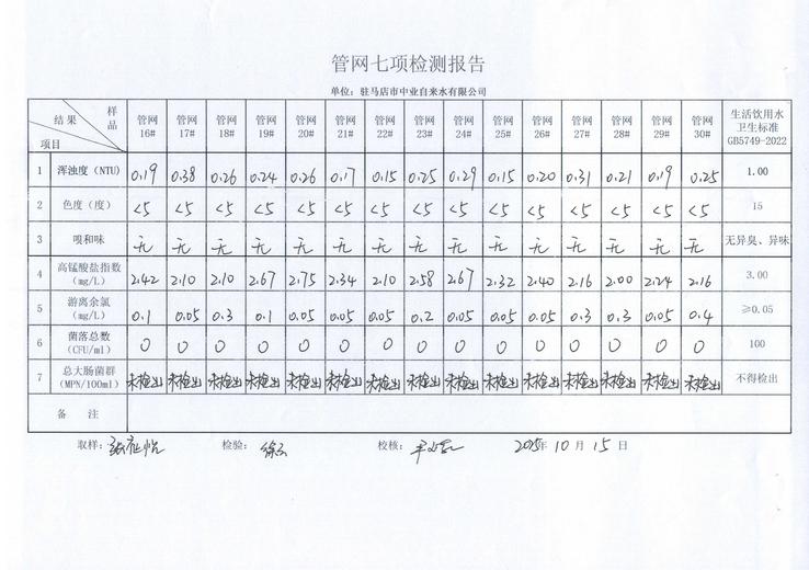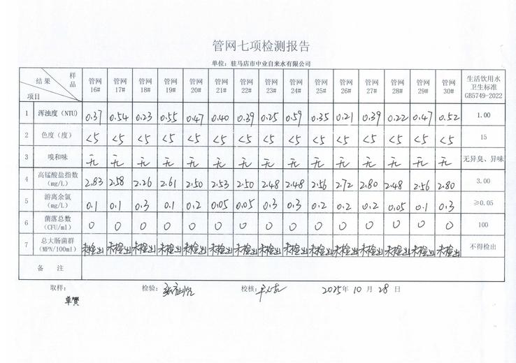 2025年10月管网水质监测数据